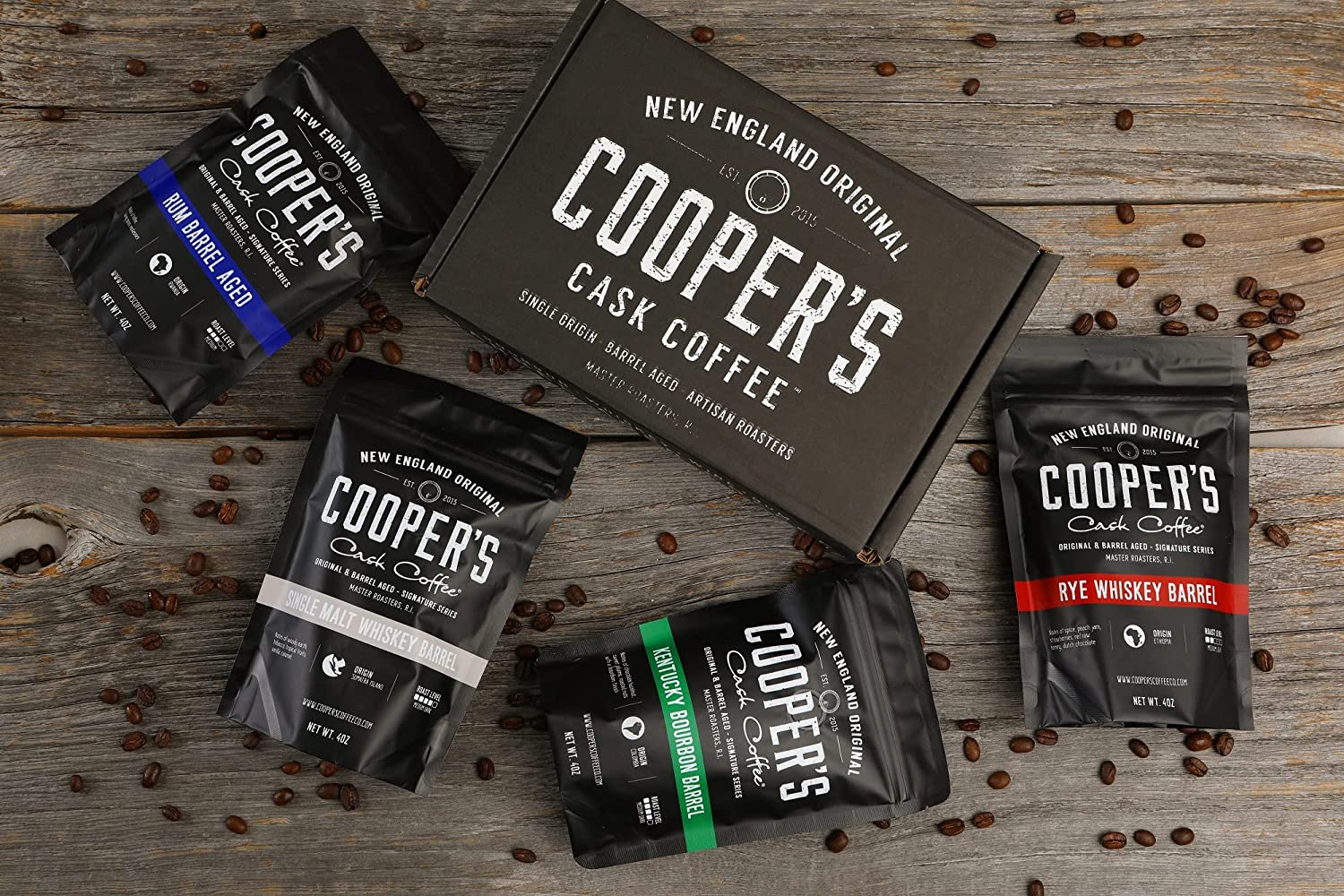 Made from premium single origin Ethiopian coffee beans, Rye Whiskey Barrel Aged Coffee from Cooper’s Cask Coffee is a true original. This intoxicating medium roast includes a bright, lively taste profile and a mix of complex flavors—including peaches, strawberries, raw red honey, and a touch of dutch chocolate.